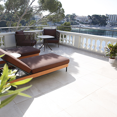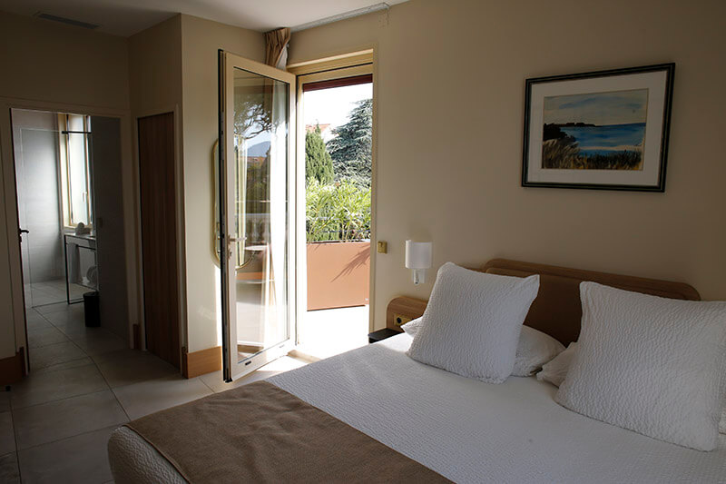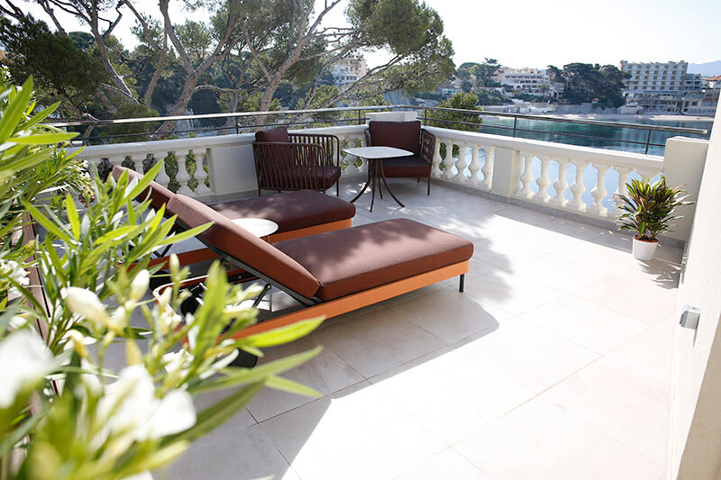 Assurément la terrasse préférée. Situé au dernier étage, lumineuse, Grenat vous invite à jouir de sa terrasse privée de 26m2 dominant l’hôtel et la baie. Une terrasse à vous donner le vertige qui prend le soleil du lever au coucher et vous procure un point de vue remarquable. Un lavabo double vasque, douche a effet de pluie et des toilettes indépendantes complètent le confort.
