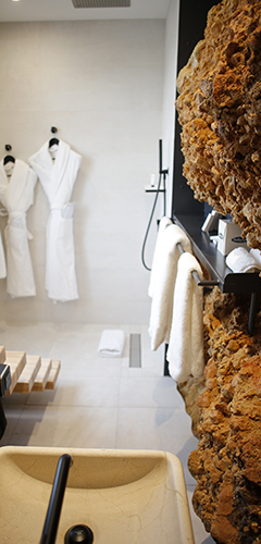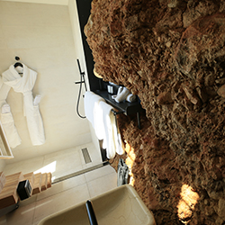 Une des chambres les plus atypiques sur deux niveaux. Au premier, outre les toilettes indépendantes le lit king size fait face à la baie, sensation de voguer. Jaspe s’ouvre sur une terrasse privée couverte. A l’étage inférieur, appréciez le naturel de la salle de bain creusée dans la roche, bien évidemment vue mer.