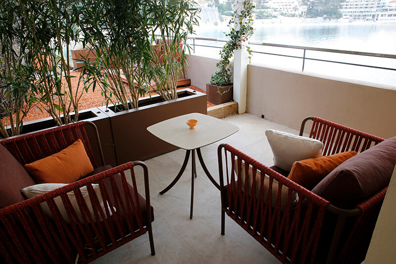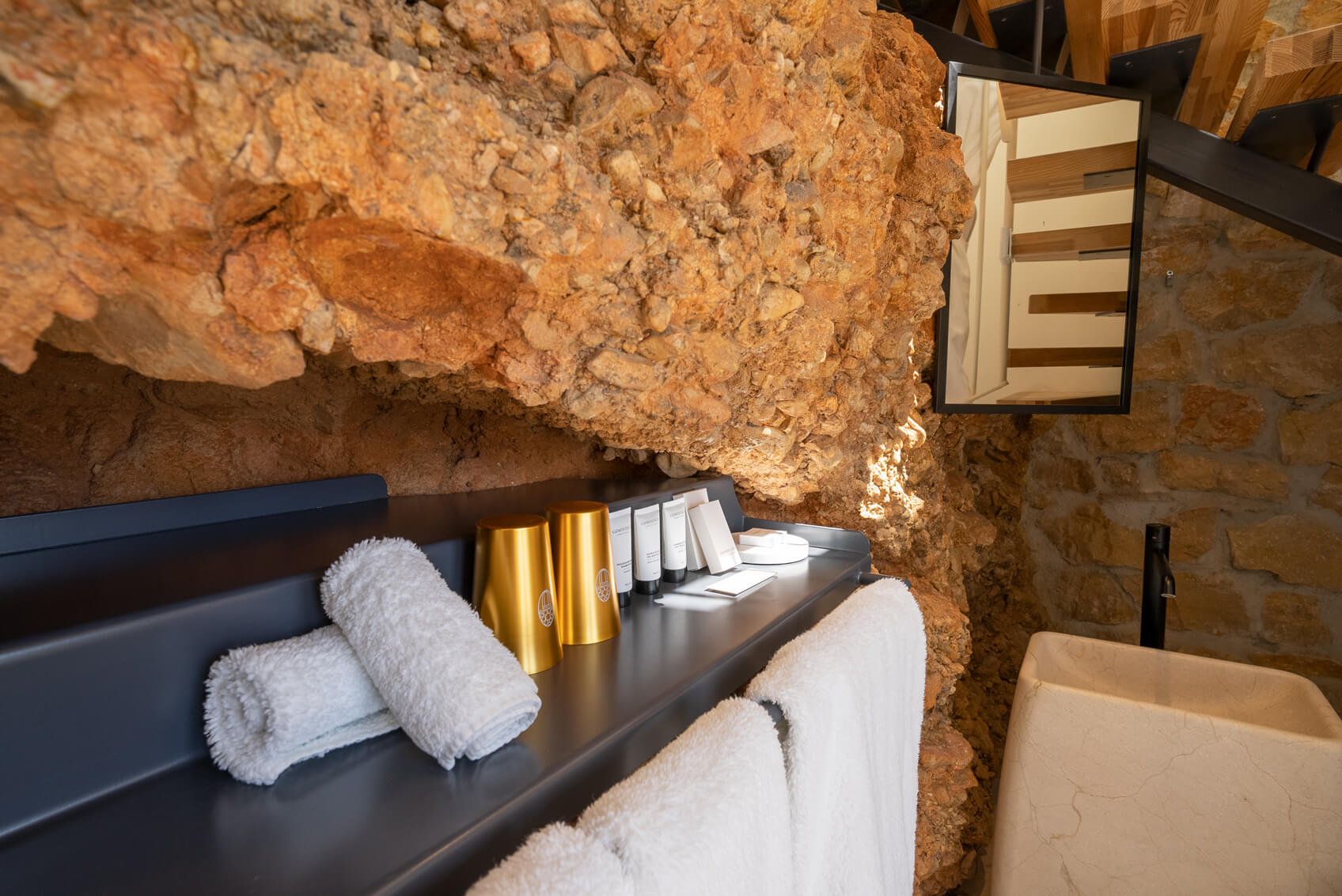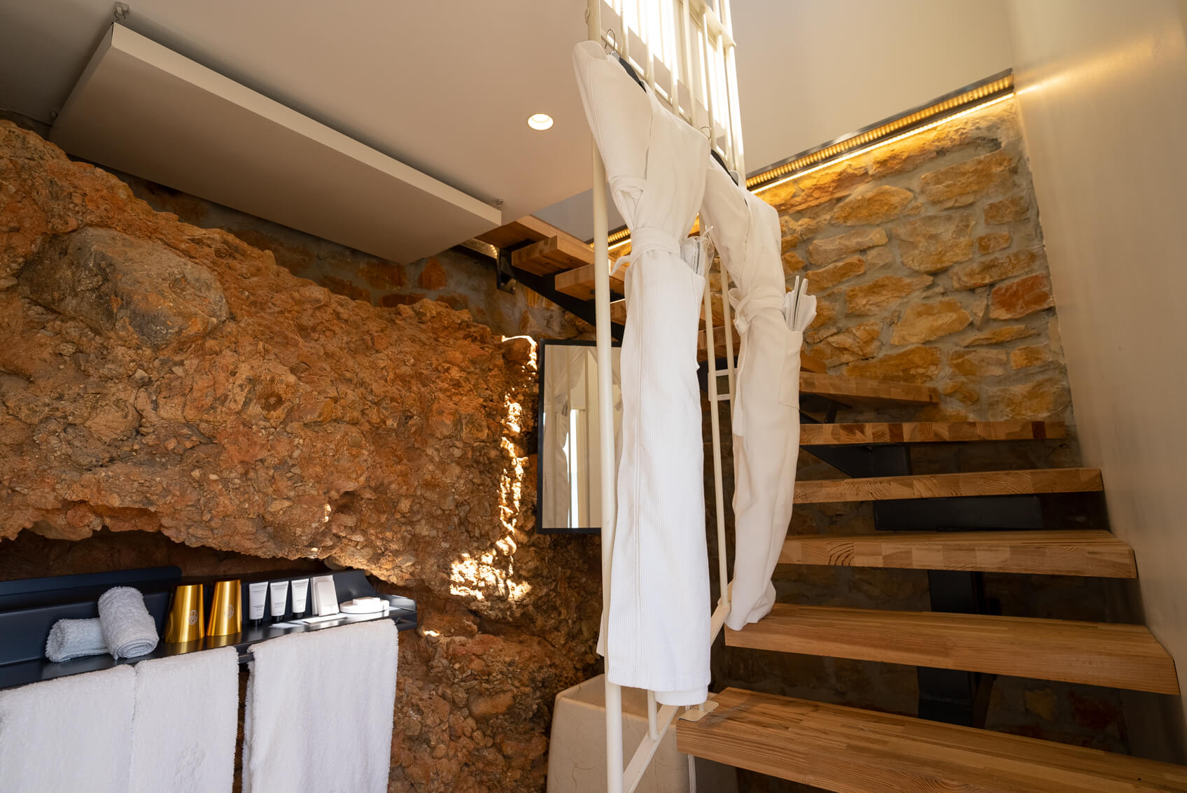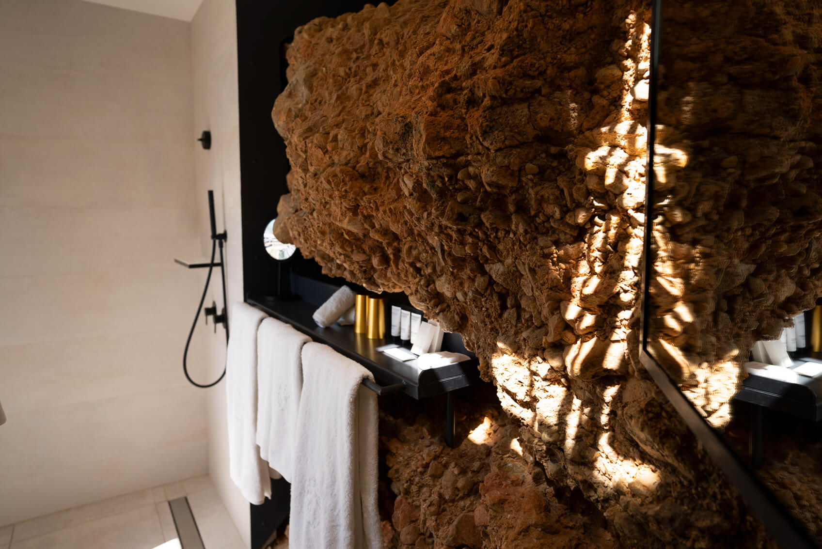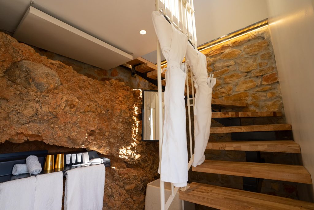 Une des chambres les plus atypiques sur deux niveaux. Au premier, outre les toilettes indépendantes le lit king size fait face à la baie, sensation de voguer. Jaspe s’ouvre sur une terrasse privée couverte. A l’étage inférieur, appréciez le naturel de la salle de bain creusée dans la roche, bien évidemment vue mer.